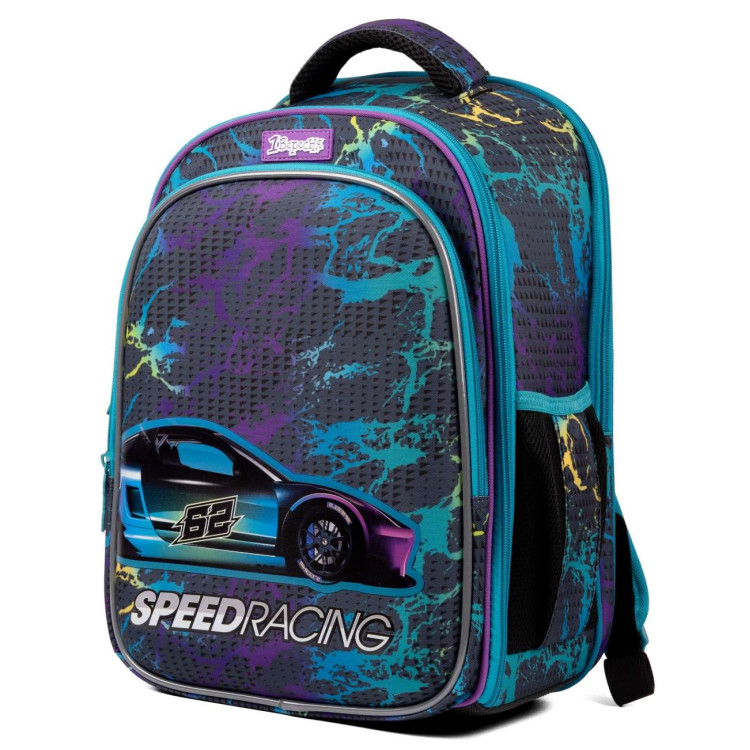 Шкільний рюкзак 1 вересня, каркасний, два основних відділення, одна фронтальна кишеня, дві відкриті бічні кишені, відділення для шкільного приладдя, органайзер, світловідбивні елементи, нагрудний ремінь, розмір: 41*29*14,5 см, сірий Speed Racing.